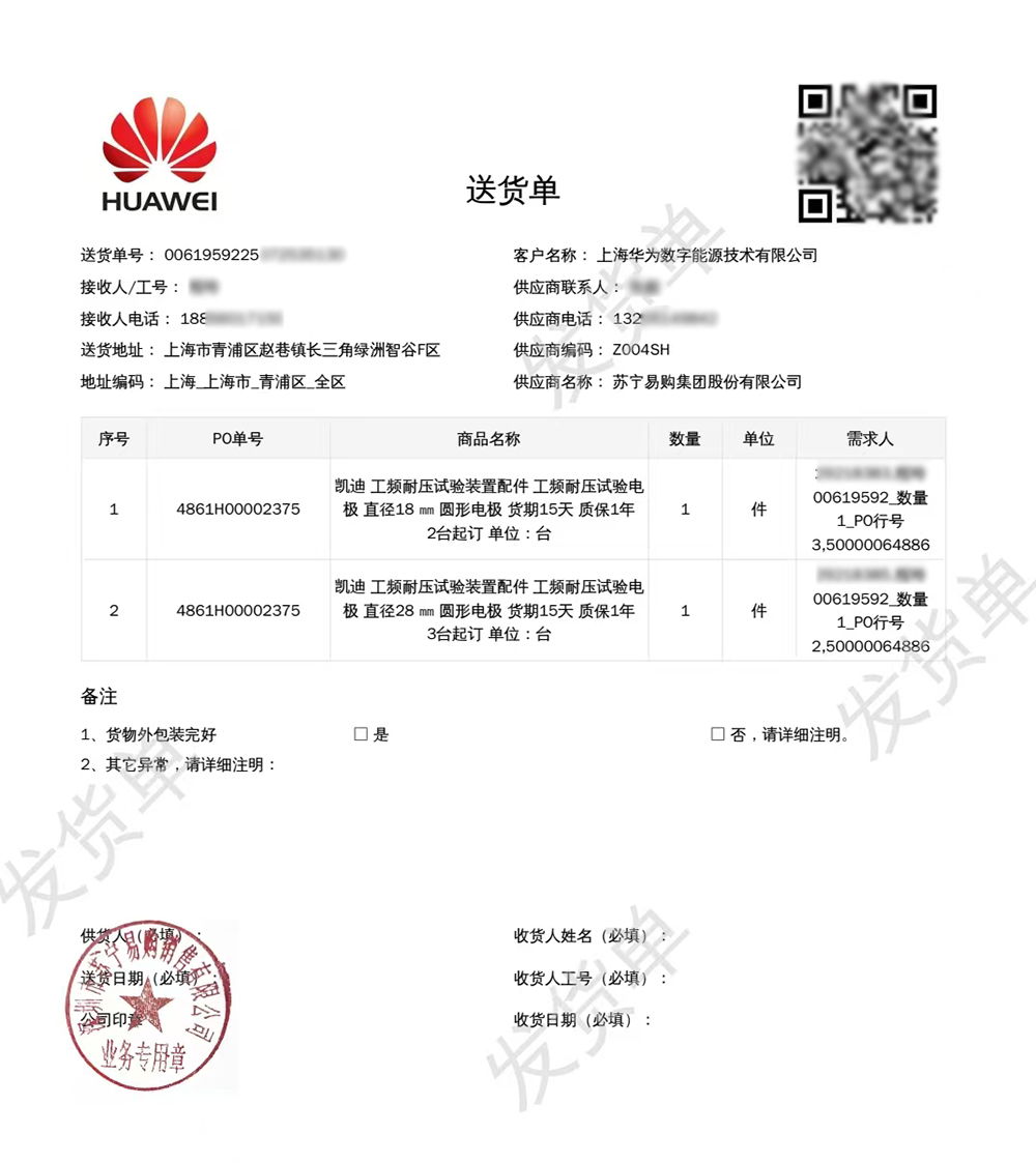 近日,武漢凱迪正大電氣有限公司自主研發生產的直徑18mm、28mm工頻耐壓試驗圓形電極,成功供應上海華為數字能源技術有限公司。