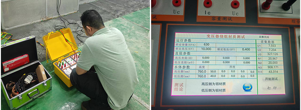 經(jīng)KDBR-CZ配電變壓器銅鋁材質(zhì)判別測試儀檢測,干式電力變壓器(型號 SCB13-630/10:4)的高壓側(cè)為鋁材質(zhì),低壓側(cè)也為鋁材質(zhì)。